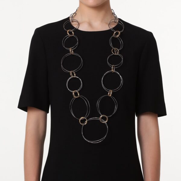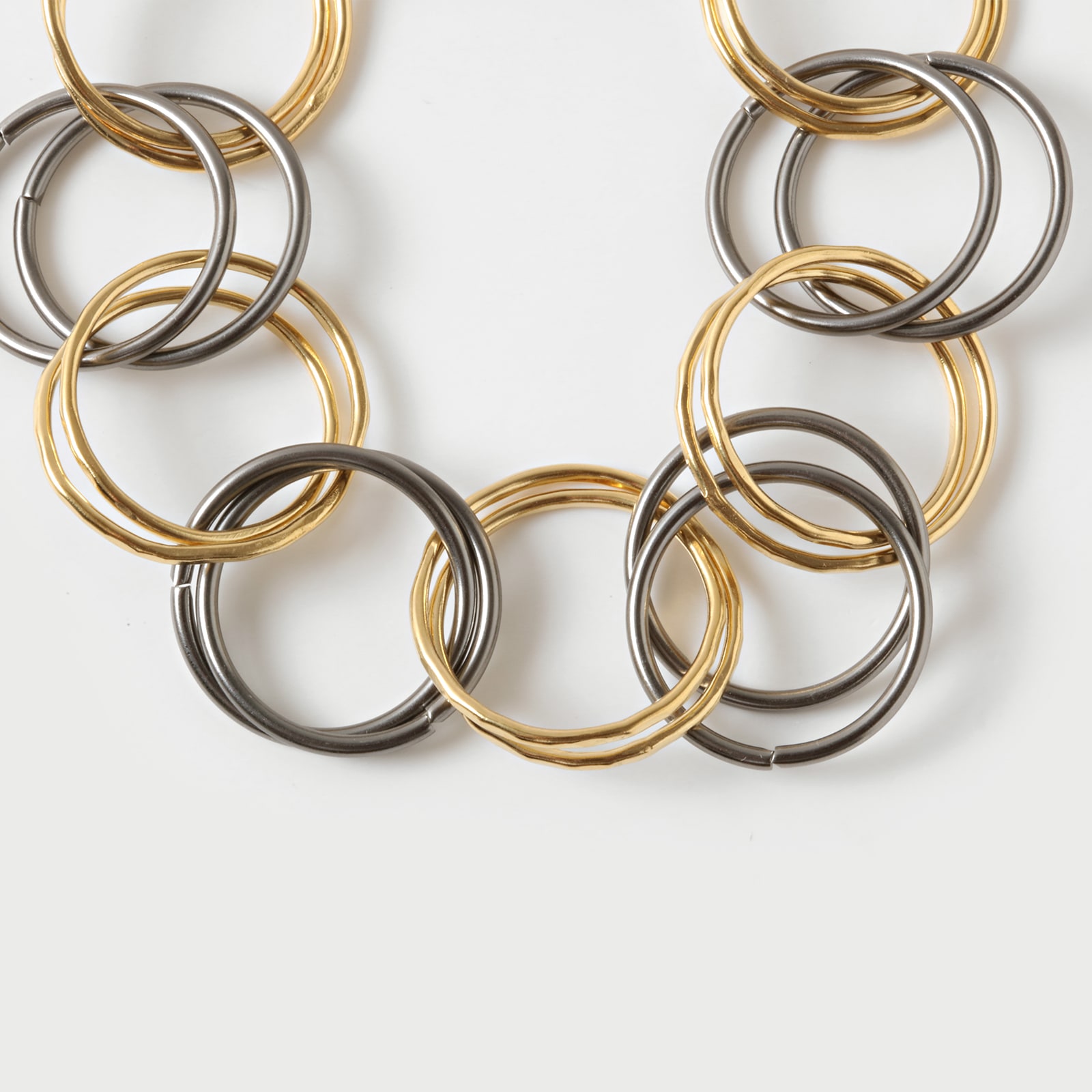 Double hoops create an exuberant chain. The visual effect created by the two-tone color adds style to a bracelet that, through its simple design line, manages to make a loud intervention in the appearance.