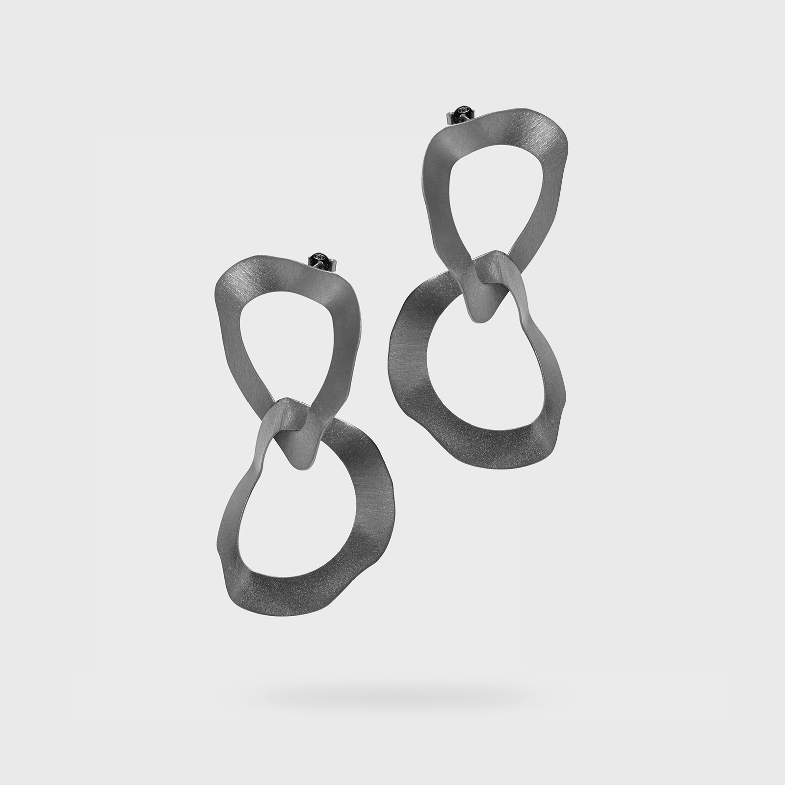 An ingenious bend is enough to turn two simple circles into a pair of earrings with a strong personality. The crumpled metal favours the light’s reflections and frames the face with an 80s attitude.