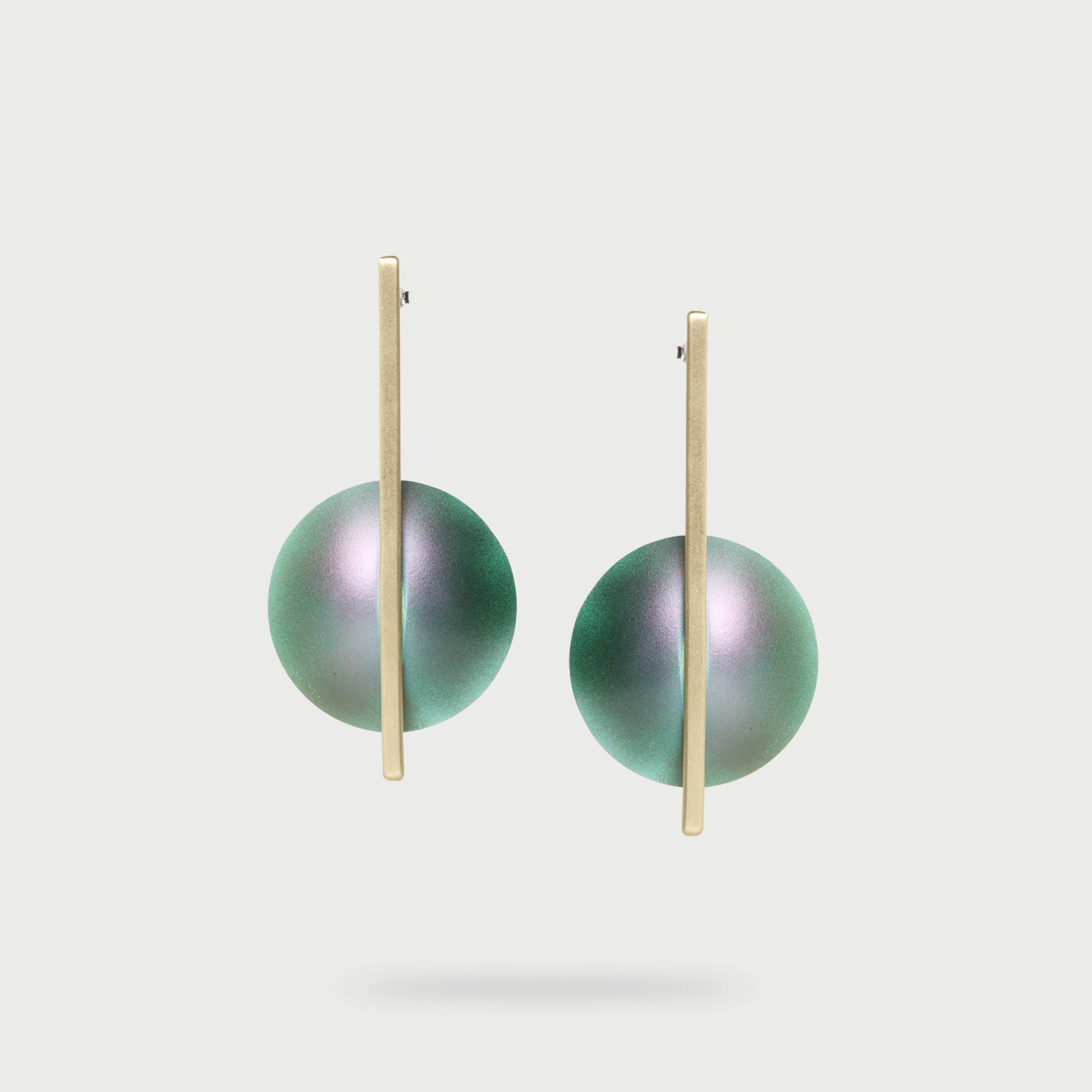 A vertical rod intersects the circle highlighting the dynamics of the geometry. Ιridescent green creates beautifull light reflections that balance the austeri-ty and becomes the visual surprise that adds bolness and style to the look.