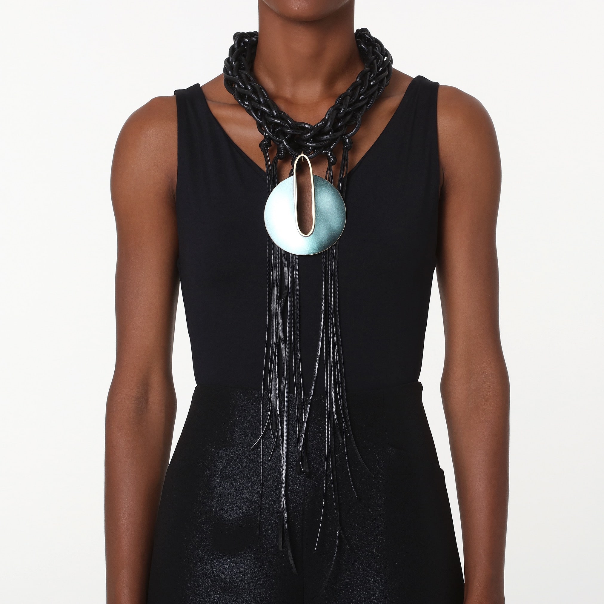 A light oval shape interrupts the circle’s curve, creating an unexpected pop shape that stars in this exuberant necklace. Black rope and cords highlight geometry, while the iridescent purple favors the light’s reflections. A piece of jewellery with an ethnic twist that makes an impressive statement.
