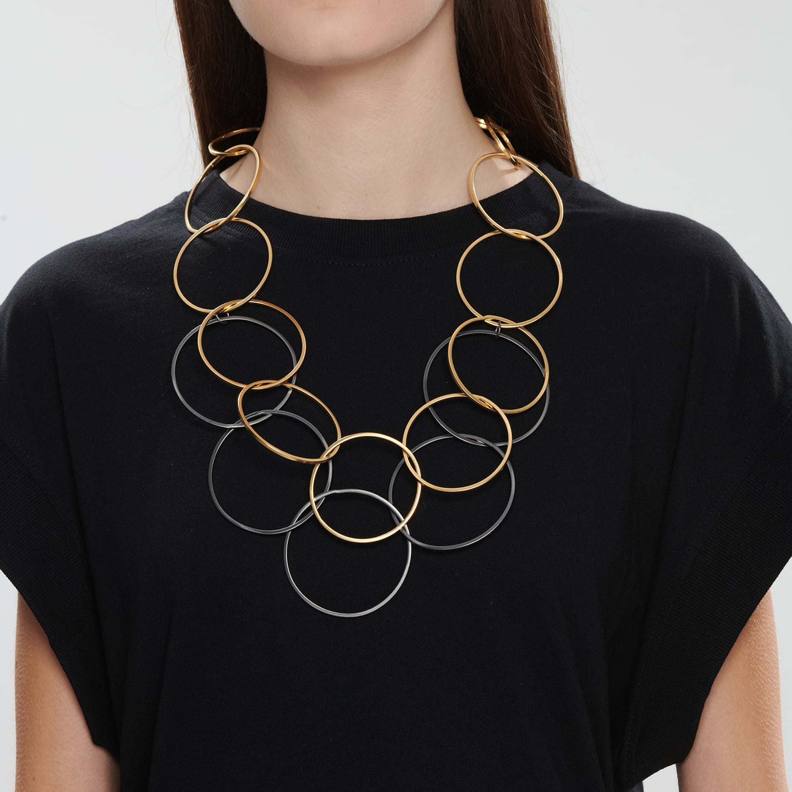 Gold and black are harmoniously combined celebrating the dynamics of the circle in a lush necklace. The shapes increase as the jewellery evolves creating a stylistic statement even to the simplest look.