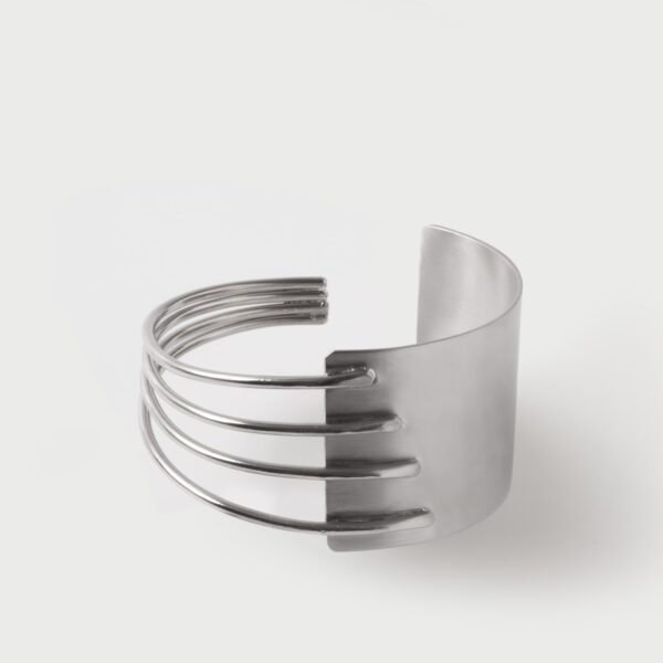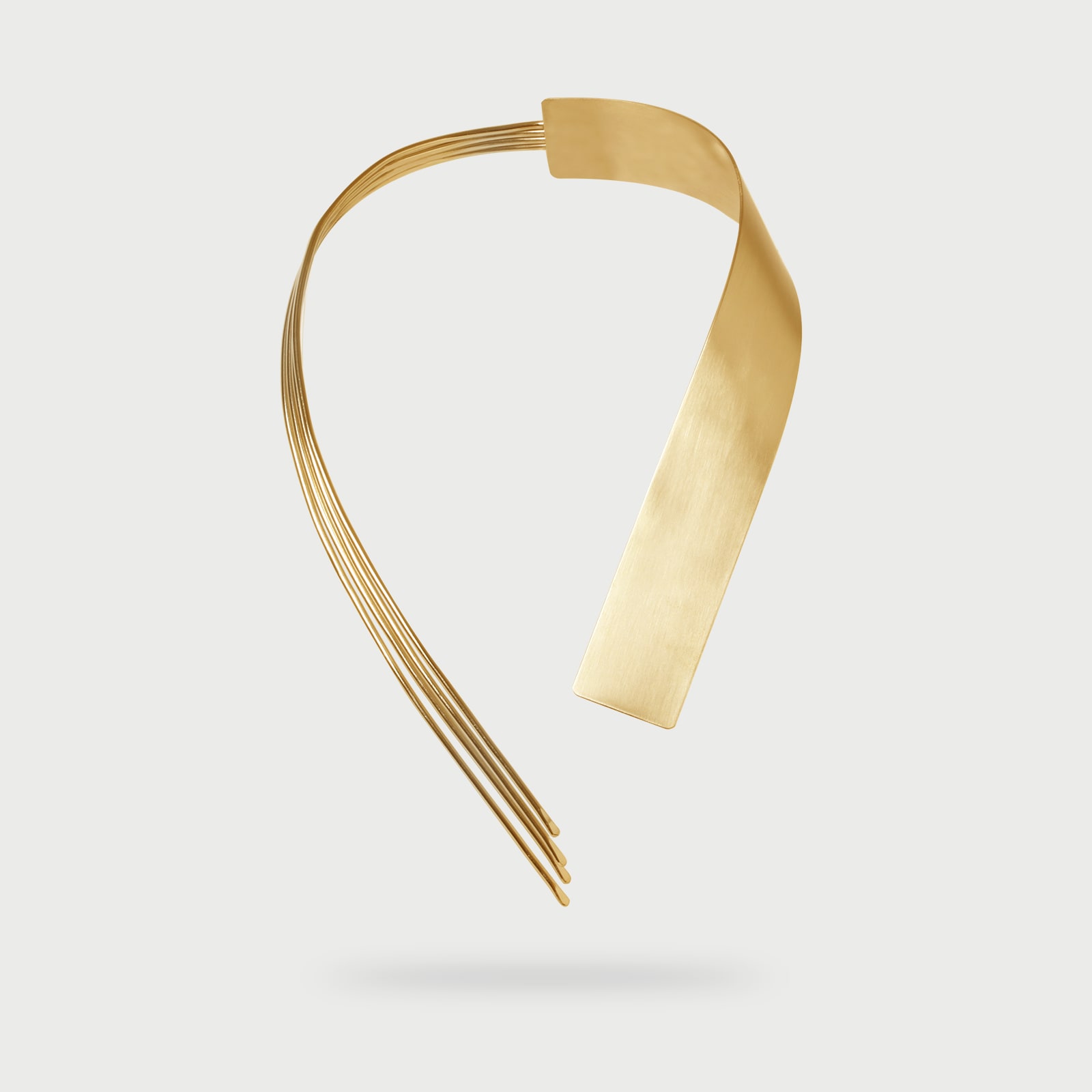 The power of the clean and smooth surface of the metal joins with the deli-cate dynamics of four “spokes” to create a piece of jewellery that glorifies contrasts. A necklace that surprises with its aesthetic twists and minimal elegance.