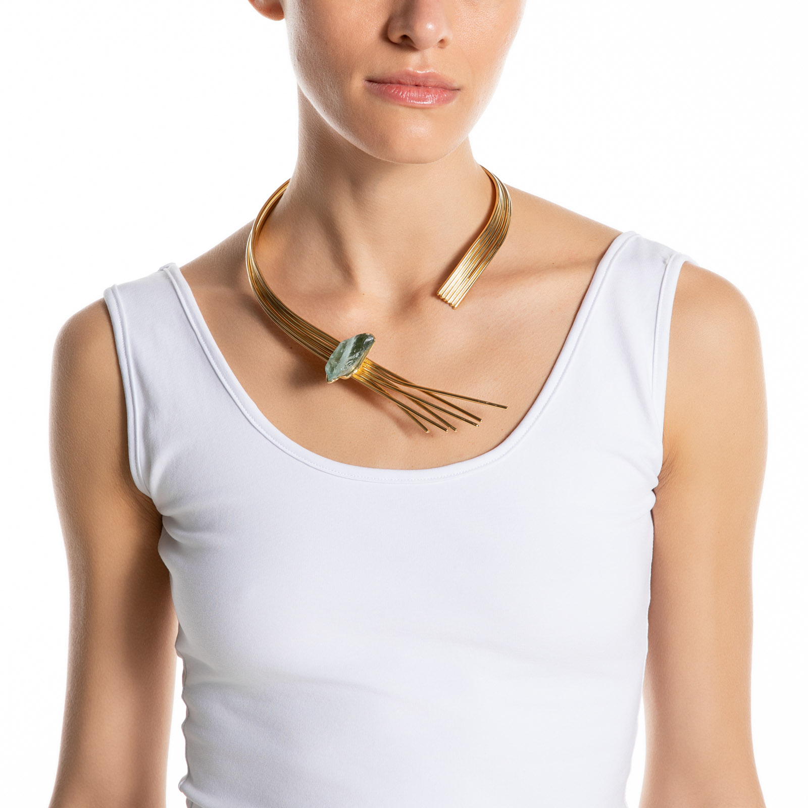 Like tree branches intertwining as they meet around the trunk, the bars composing this necklace highlight not a flower, but a gemstone that radiates its old Hollywood glamour upon us.
